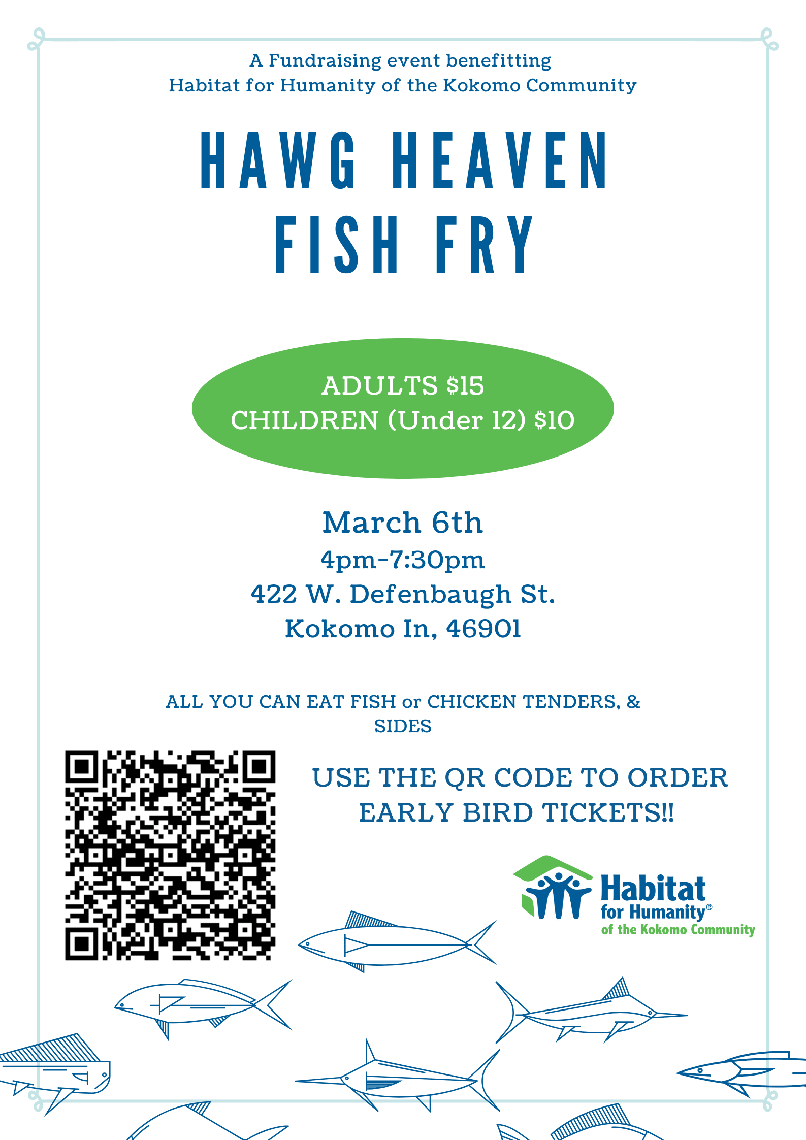 We have partnered with Hawg Heaven to bring you a Fish Fry! Join us on Friday, March 6th from 4-7:30pm at Hawg Heaven ( 422 W. Defenbaugh St. Kokomo) to feast on all you can eat fish, tenderloins, chicken tenders, and sides! Tickets are on sale now for $15 ($10 for children under 12).